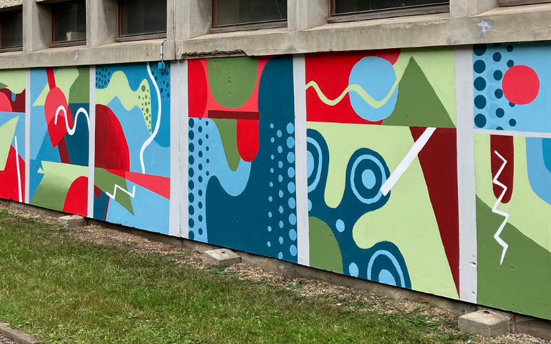 Réalisation d’une peinture participative à 30 mains sur la cartablerie du collège avec les élèves de 6eme et l’artiste BREZ.