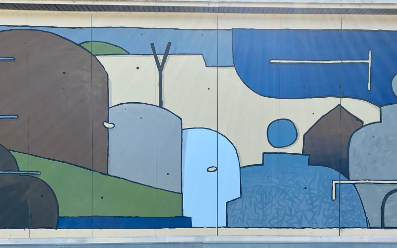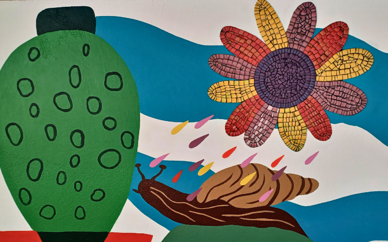 Réalisation d’une fresque “Peinture et Mosaïque” dans la cour de l’école avec la classe de CM2 et l’artiste Katja Bot et l’artisane Marie Martin.